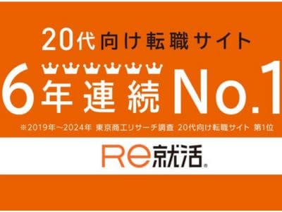 2018年から全国展開のTVCMをスタートしたRe就活は、「20代が選ぶ転職サイト6年連続No.1」に選ばれました(※2019~2024年 東京商工リサ―チ調査)。新卒情報サイト「Re就活キャンパス」はオリコン顧客満足度調査で、4年連続「就活支援コンテンツ」第1位を獲得しています(※2024年 オリコン顧客満足度(R)調査 逆求人型就活サービス 就活支援コンテンツ 第1位)。