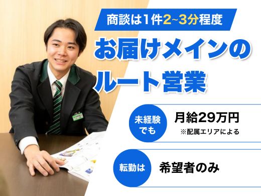 当社のルート配送は、「配送7割、営業3割」と商品のお届けがメインなので、今まで経験がない方でも始めやすいのが特徴です。