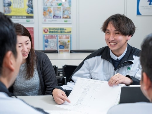 お客様(ゼネコン)と図面の修正や打合せを何度かやり取りし、承認が下りれば資材や施工を行う職人さんを手配します。その後は自ら現場で指揮を執り、施工管理を行います。設計と施工管理の分業制を敷く会社も多いですが、当社は担当者が最初から最後まで関わります。担当案件が完成するまで見届けられるのは当社の醍醐味です。