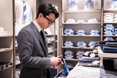 接客の実践は、まずシャツのオーダーから担当。3ヶ月程度経験を積み、その後は少しずつスーツのオーダーも経験していきましょう。