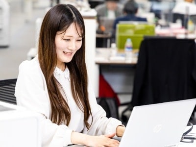 週2回くらい外出の機会がありますが、オフィス内で仕事をすることが多く、イメージとしては一般事務に近いです。こちらの職種でも、チームプレイが重要となり、チーム内での情報共有や連携を図りながら業務を進めます。部署によっては在宅勤務も可能です!