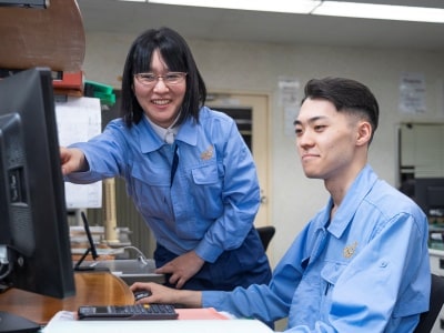 入社後は、1~3ヵ月間の現場研修を通じて、製品がどのようにつくられているかを学びます。その後、技術部にてOJTがスタート。先輩がマンツーマンで丁寧に指導します。