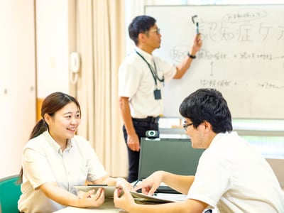 入職後は新入職員と同じ研修カリキュラムを受講。「社会人マナー」や「介護の基礎知識」を身に付けるところからスタートできます。その後は週1回の座学研修で専門知識を学びつつ、現場では先輩によるOJTで実務を習得。安心して一歩ずつスキルを磨けます。