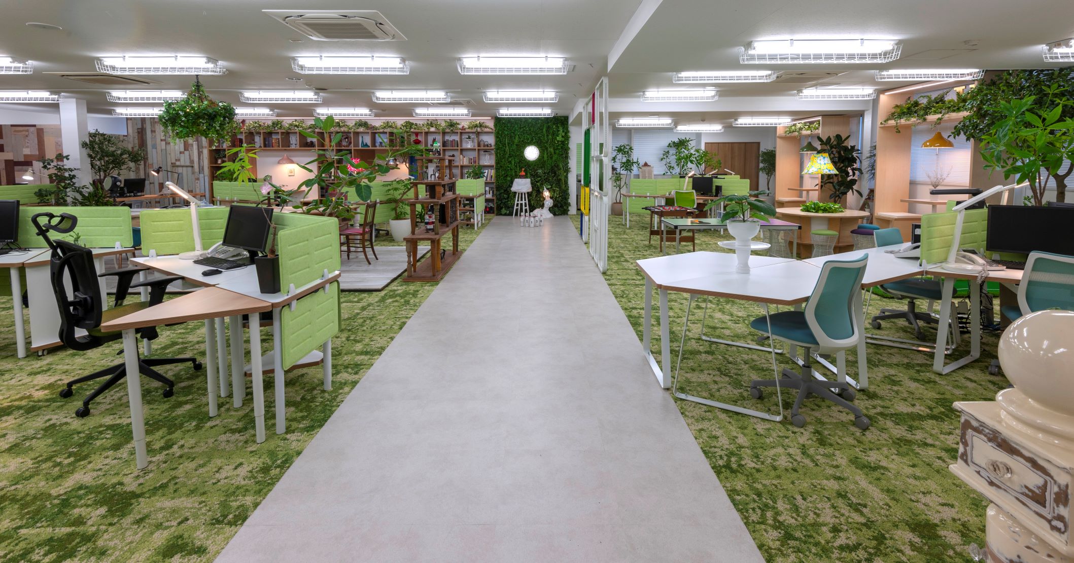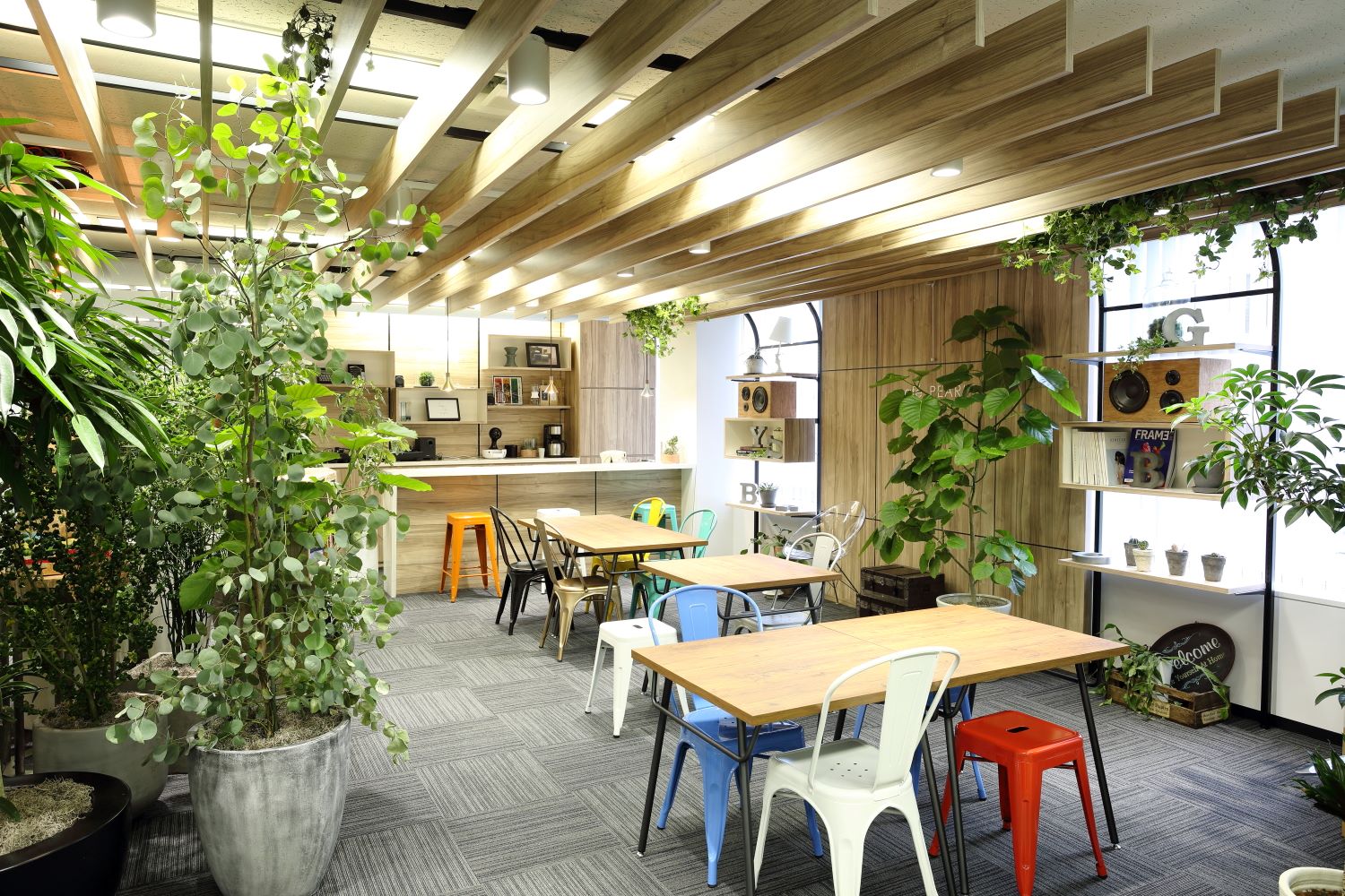 オフィス環境は、当社ならではの“空間づくりのプロ”のこだわりが詰まったデザイン。観葉植物を多く取り入れたグリーンあふれる空間で、自然を感じながら落ち着いて働けます。明るく開放的な雰囲気の中で、社員同士のコミュニケーションも活発。アイデアが生まれやすく、仕事に集中できる心地よい環境が整っています。