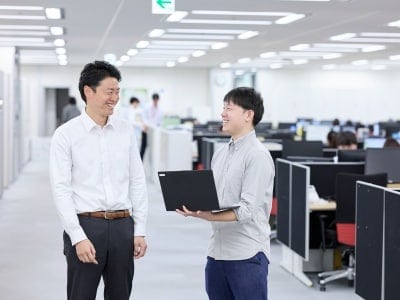まずは新卒社員と一緒に、約1ヵ月半の集合研修からスタート。ビジネスマナーや会社の事業について基礎から学びます。その後、4年間で2つの部署を経験するジョブローテーションが始まります。各配属先では、先輩社員がOJTで丁寧に指導しますので、一つひとつの業務を着実に身につけていけます。