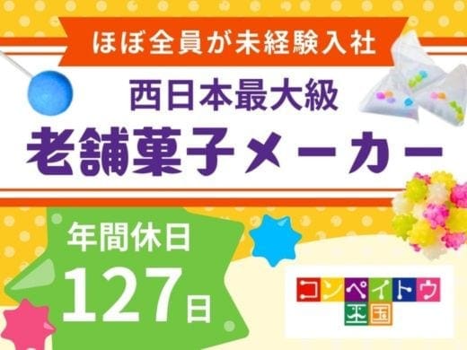 あなたにお任せするのは、子どもから大人まで、多くの人に愛される砂糖菓子(チャイナマーブルなど)の製造業務です。2~3名のチームで協力しながら、午前・午後のローテーション制で様々な工程を担当し、ひとつの製品を完成させていきます。