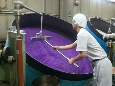 砂糖やコーンスターチなどの原料を計量し、大きな釜に投入。レシピ通りに進めればOKなので、難しいことはありません。