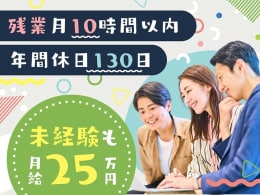 完全週休2日制 年間休日120日以上 残業少なめ(1日1時間以内) 月給25万円以上 転勤なし 面接1回 土日面接OK 書類選考なし